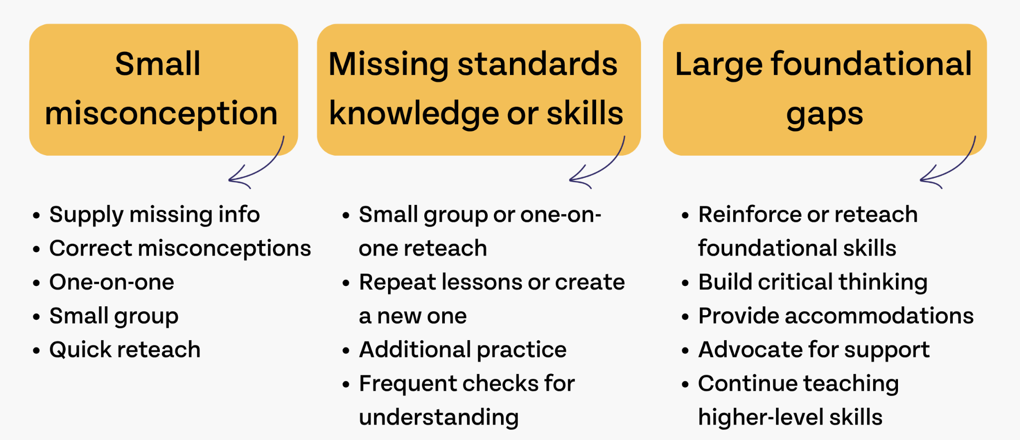 Bigger misconceptions might need re-teaches, one-on-one work, and group interventions. Let’s say a student can’t seem to master a learning standard and needs some time and attention to build the necessary knowledge or skills to get there. For example, the student doesn’t seem to understand the causes for World War II.