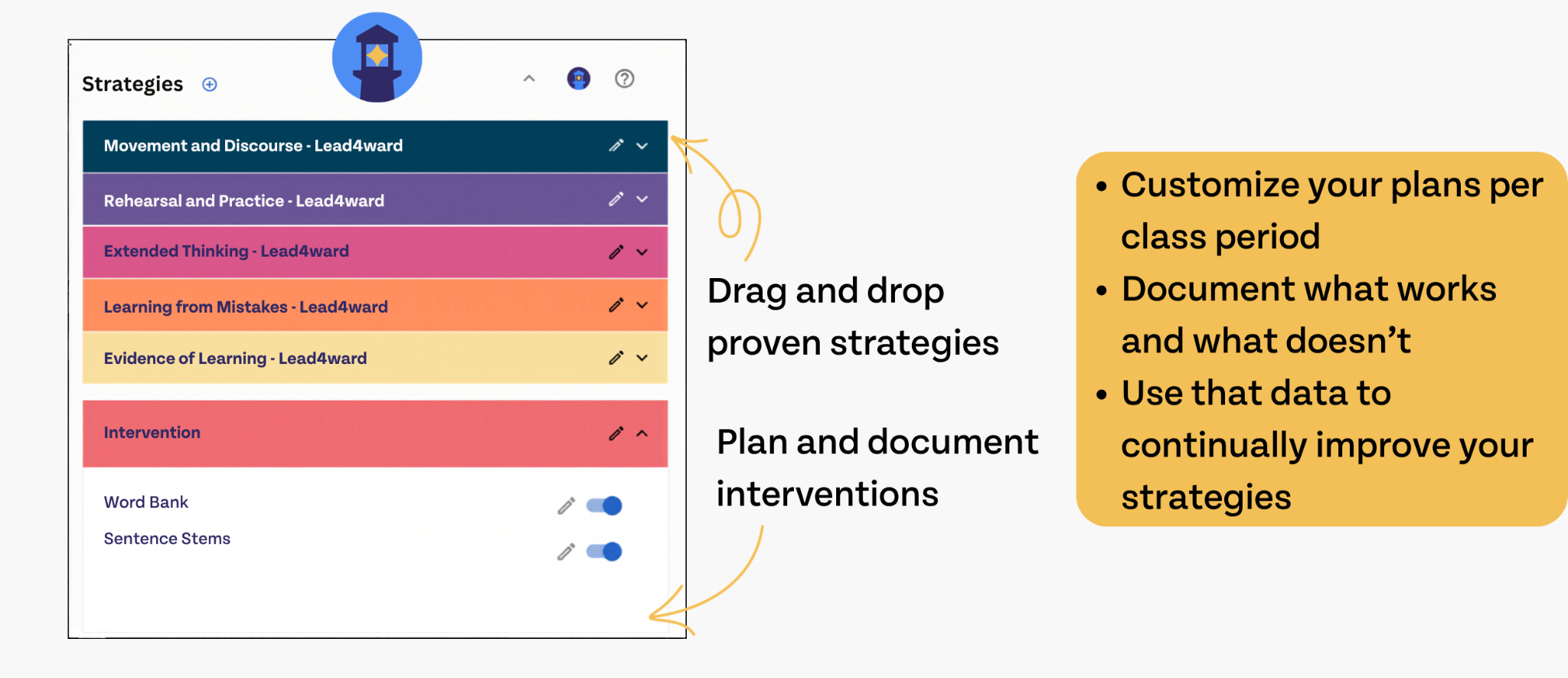 Once you know what your students need, you shold be able to make fast, easy adjustments to your lessons to plan for their intervention and enrichment. With Beacon, you can drag-and-drop proven strategies into your lessons.